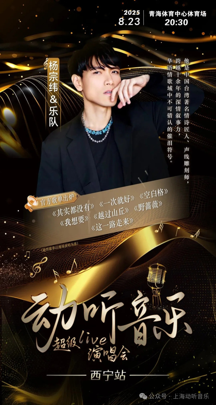 据主办方动听(上海)音乐文化发展有限公司官方平台,8月23日,在青海体育中心体育场举行的演唱会由潘玮柏、萧敬腾、杨宗纬、彭佳慧领衔。现场有百米超维舞台360°环绕视觉、1500㎡巨幕光影交互、法国阿酷司殿堂级音响……是一场无主持、全沉浸的视听狂欢。